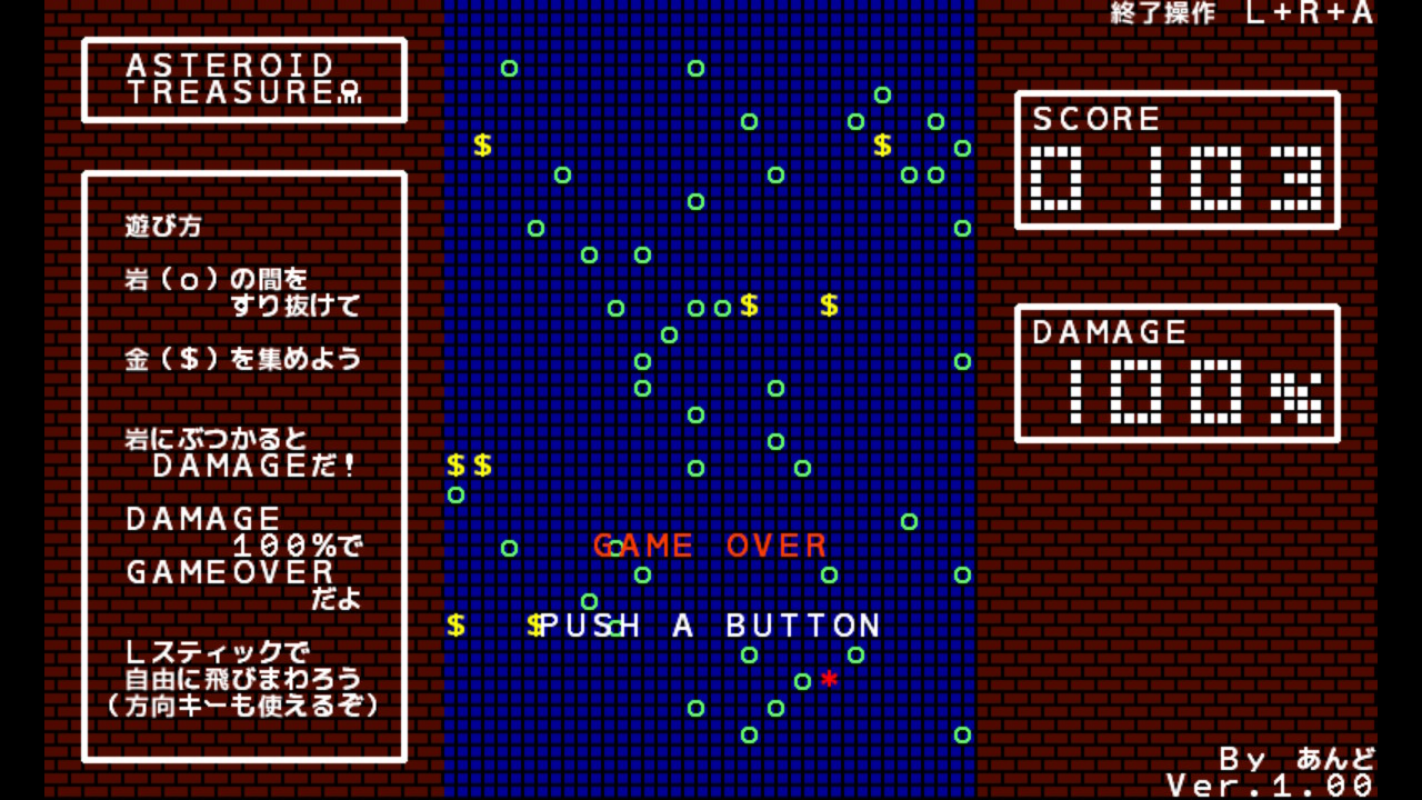 『ASTEROID TREASURE』 作者:あんどさん 公開キー:4AJ48384 タグ:アクション,,, #プチコン4 #SmileBASIC #petitcom #SmileBASIC作品一覧のハコ https://smilebasic.kurun96.com/work/4AJ48384/
